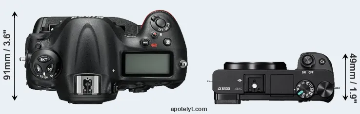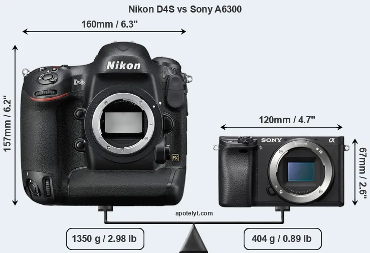 An illustration of the physical size and weight of the Nikon D4S and the Sony A6300 is provided in the side-by-side display below. The two cameras are presented according to their relative size. Three consecutive views from the front, the top, and the rear side are shown. All width, height and depth measures are rounded to the nearest millimeter.