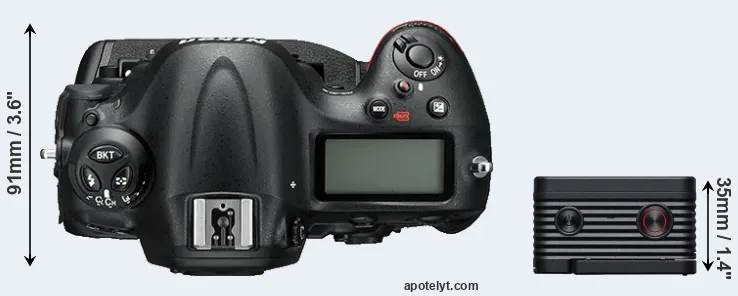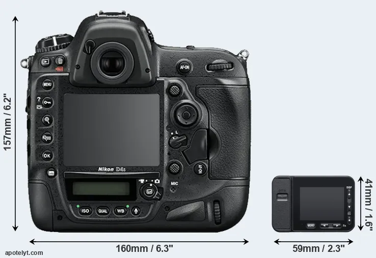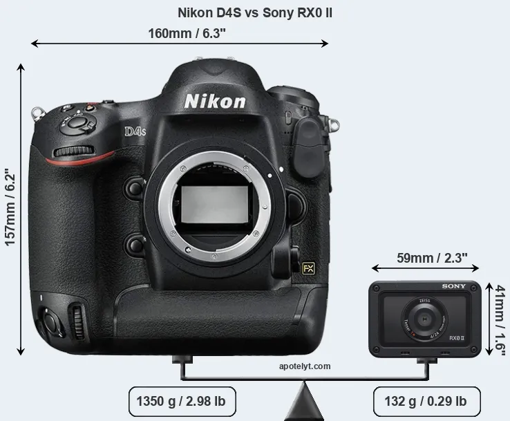 The side-by-side display below illustrates the physical size and weight of the Nikon D4S and the Sony RX0 II. The two cameras are presented according to their relative size. Three consecutive perspectives from the front, the top, and the back are available. All width, height and depth dimensions are rounded to the nearest millimeter.