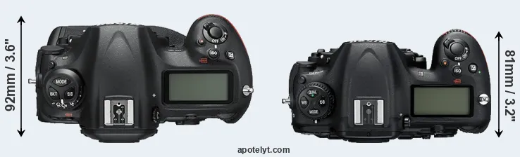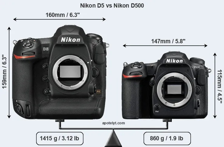The side-by-side display below illustrates the physical size and weight of the Nikon D5 and the Nikon D500. The two cameras are presented according to their relative size. Three successive views from the front, the top, and the rear are shown. All width, height and depth measures are rounded to the nearest millimeter.