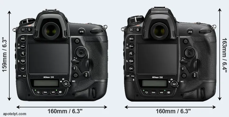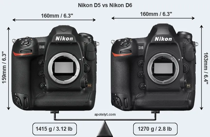 The physical size and weight of the Nikon D5 and the Nikon D6 are illustrated in the side-by-side display below. The two cameras are presented according to their relative size. Three consecutive perspectives from the front, the top, and the back are available. All width, height and depth dimensions are rounded to the nearest millimeter.