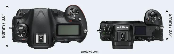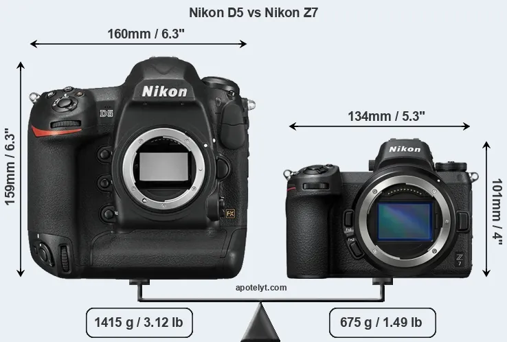 The side-by-side display below illustrates the physical size and weight of the Nikon D5 and the Nikon Z7. The two cameras are presented according to their relative size. Three consecutive views from the front, the top, and the rear side are shown. All width, height and depth measures are rounded to the nearest millimeter.