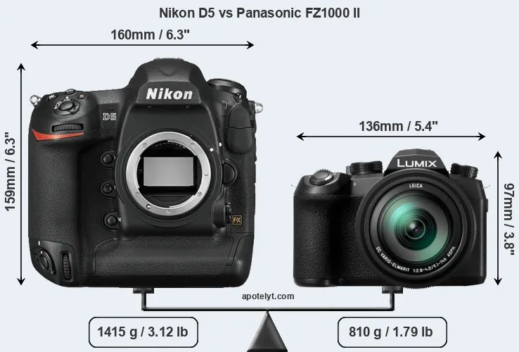 The side-by-side display below illustrates the physical size and weight of the Nikon D5 and the Panasonic FZ1000 II. The two cameras are presented according to their relative size. Three successive views from the front, the top, and the rear are shown. All width, height and depth measures are rounded to the nearest millimeter.