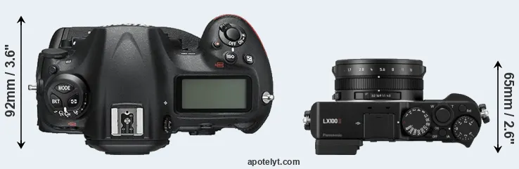 The physical size and weight of the Nikon D5 and the Panasonic LX100 II are illustrated in the side-by-side display below. The two cameras are presented according to their relative size. Three consecutive views from the front, the top, and the rear side are shown. All width, height and depth dimensions are rounded to the nearest millimeter.