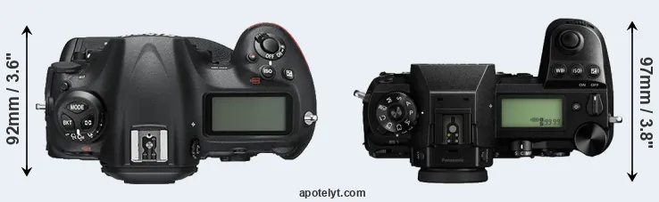 The physical size and weight of the Nikon D5 and the Panasonic S1 are illustrated in the side-by-side display below. The two cameras are presented according to their relative size. Three consecutive views from the front, the top, and the rear side are shown. All width, height and depth dimensions are rounded to the nearest millimeter.