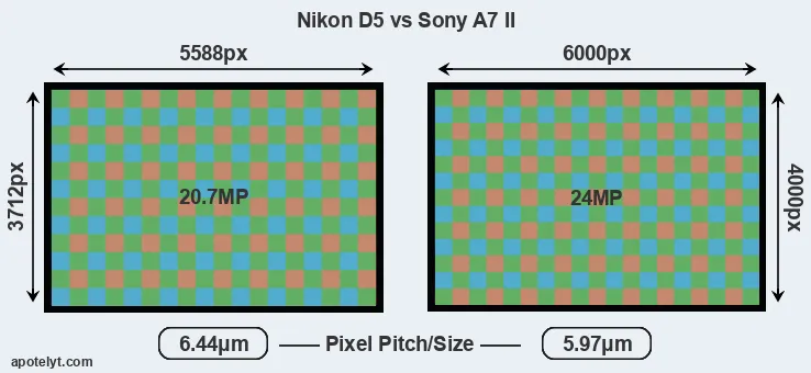 Despite having a slightly smaller sensor, the A7 II offers a higher resolution of 24 megapixels, compared with 20.7 MP of the D5. This megapixels advantage comes at the cost of a higher pixel density and a smaller size of the individual pixel (with a pixel pitch of 5.97μm versus 6.44μm for the D5). Moreover, it should be noted that the D5 is a somewhat more recent model (by 1 year and 1 month) than the A7 II, and its sensor might have benefitted from technological advances during this time that further enhance the light gathering capacity of its pixels.
