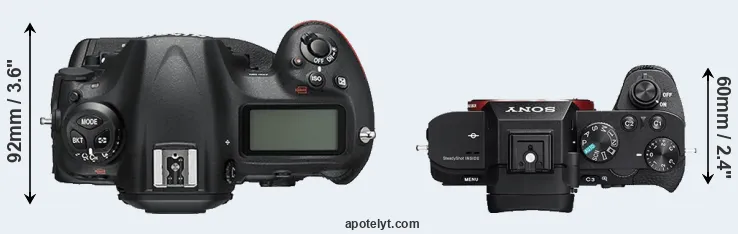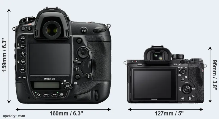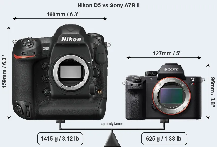 The side-by-side display below illustrates the physical size and weight of the Nikon D5 and the Sony A7R II. The two cameras are presented according to their relative size. Three consecutive perspectives from the front, the top, and the back are available. All width, height and depth measures are rounded to the nearest millimeter.
