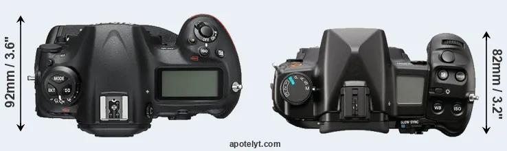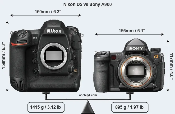 The side-by-side display below illustrates the physical size and weight of the Nikon D5 and the Sony A900. The two cameras are presented according to their relative size. Three consecutive views from the front, the top, and the rear side are shown. All width, height and depth measures are rounded to the nearest millimeter.