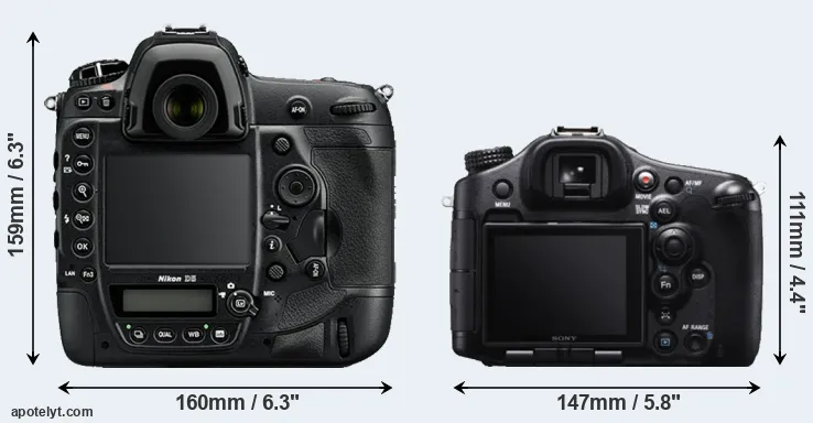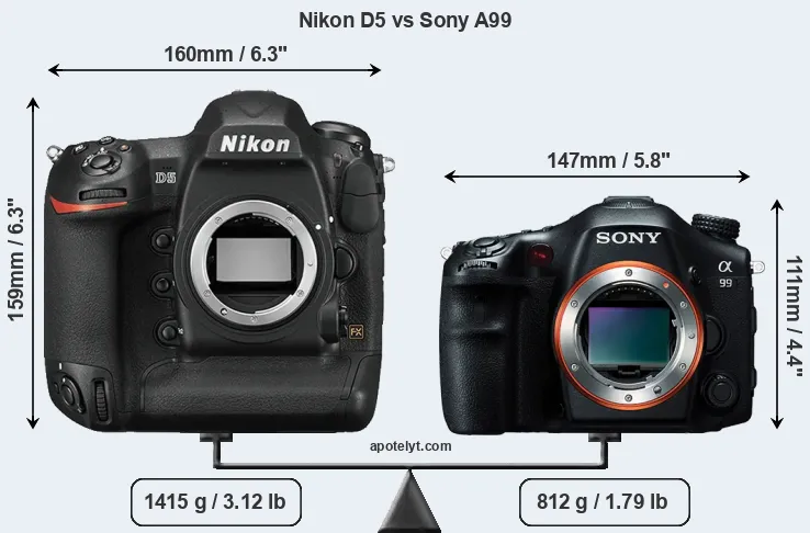 The physical size and weight of the Nikon D5 and the Sony A99 are illustrated in the side-by-side display below. The two cameras are presented according to their relative size. Three consecutive perspectives from the front, the top, and the back are available. All width, height and depth dimensions are rounded to the nearest millimeter.