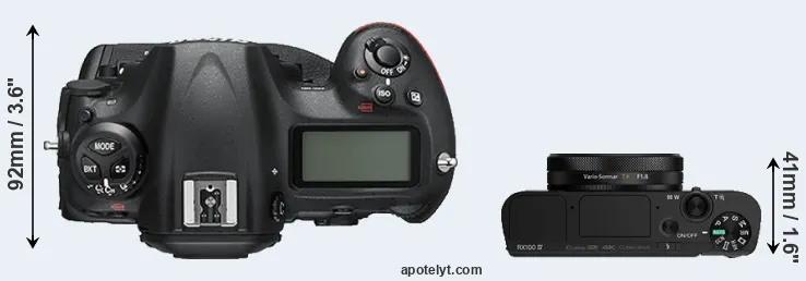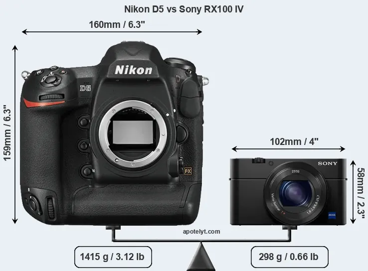 An illustration of the physical size and weight of the Nikon D5 and the Sony RX100 IV is provided in the side-by-side display below. The two cameras are presented according to their relative size. Three successive views from the front, the top, and the rear are shown. All width, height and depth dimensions are rounded to the nearest millimeter.