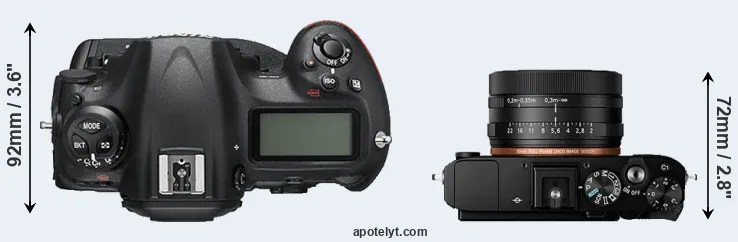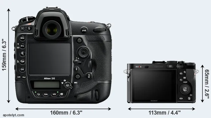 The side-by-side display below illustrates the physical size and weight of the Nikon D5 and the Sony RX1R II. The two cameras are presented according to their relative size. Three successive views from the front, the top, and the rear are shown. All size dimensions are rounded to the nearest millimeter.