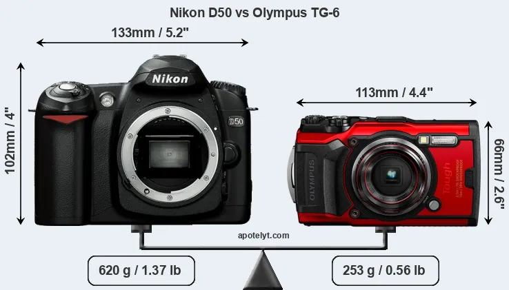The side-by-side display below illustrates the physical size and weight of the Nikon D50 and the Olympus TG-6. The two cameras are presented according to their relative size. Three consecutive perspectives from the front, the top, and the back are available. All width, height and depth measures are rounded to the nearest millimeter.
