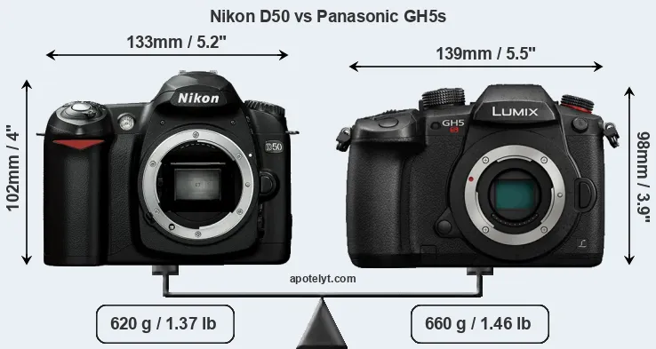 If the front view area (width x height) of the cameras is taken as an aggregate measure of their size, the Nikon D50 and the Panasonic GH5s are of equal size. However, the GH5s is markedly heavier (6 percent) than the D50. It is noteworthy in this context that the GH5s is splash and dust-proof, while the D50 does not feature any corresponding weather-sealing.
