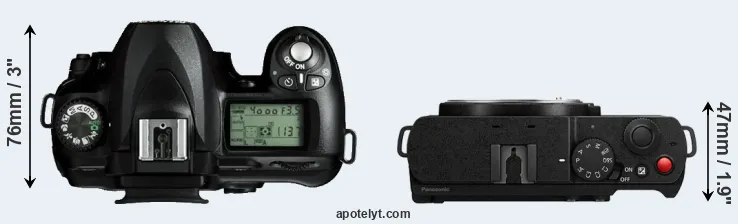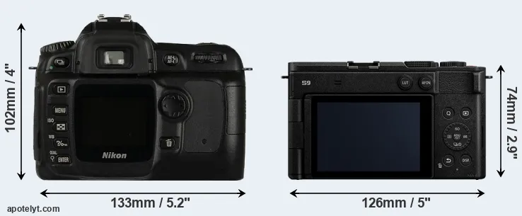 The side-by-side display below illustrates the physical size and weight of the Nikon D50 and the Panasonic S9. The two cameras are presented according to their relative size. Three consecutive perspectives from the front, the top, and the back are available. All width, height and depth measures are rounded to the nearest millimeter.
