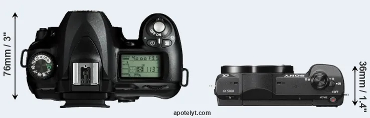 The physical size and weight of the Nikon D50 and the Sony A5100 are illustrated in the side-by-side display below. The two cameras are presented according to their relative size. Three consecutive views from the front, the top, and the rear side are shown. All size dimensions are rounded to the nearest millimeter.