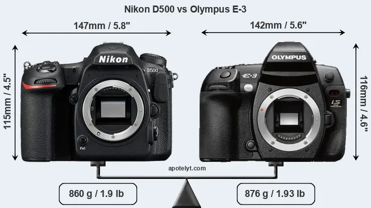 The physical size and weight of the Nikon D500 and the Olympus E-3 are illustrated in the side-by-side display below. The two cameras are presented according to their relative size. Three consecutive views from the front, the top, and the rear side are shown. All width, height and depth measures are rounded to the nearest millimeter.