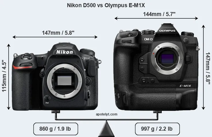 The physical size and weight of the Nikon D500 and the Olympus E-M1X are illustrated in the side-by-side display below. The two cameras are presented according to their relative size. Three consecutive perspectives from the front, the top, and the back are available. All width, height and depth dimensions are rounded to the nearest millimeter.