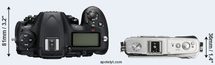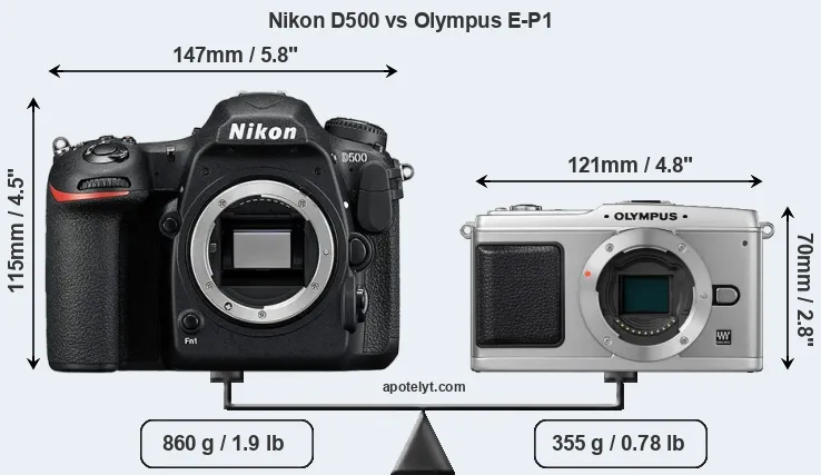 The physical size and weight of the Nikon D500 and the Olympus E-P1 are illustrated in the side-by-side display below. The two cameras are presented according to their relative size. Three consecutive perspectives from the front, the top, and the back are available. All width, height and depth dimensions are rounded to the nearest millimeter.