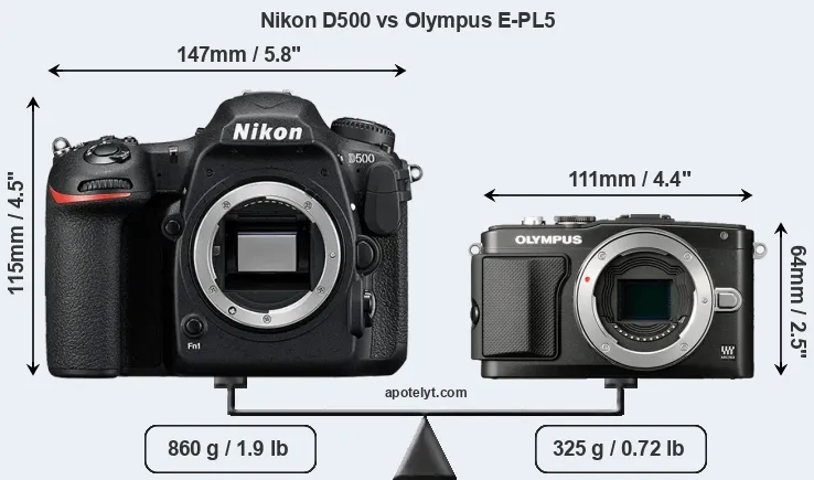 An illustration of the physical size and weight of the Nikon D500 and the Olympus E-PL5 is provided in the side-by-side display below. The two cameras are presented according to their relative size. Three successive views from the front, the top, and the rear are shown. All width, height and depth measures are rounded to the nearest millimeter.