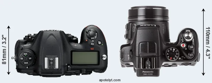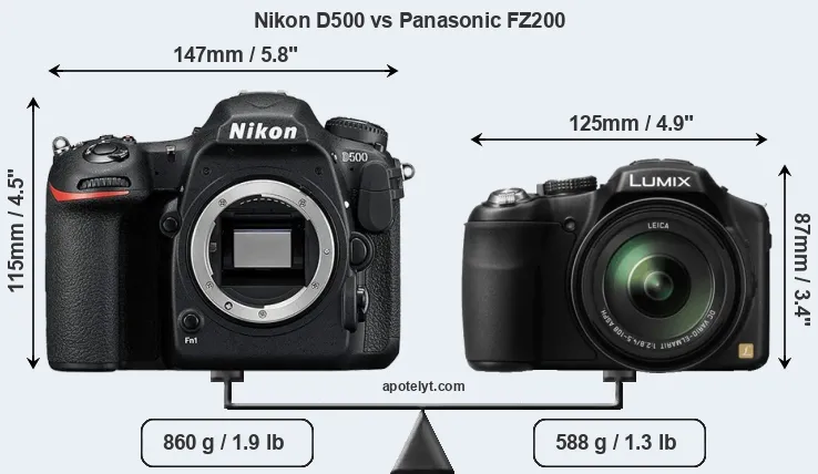 An illustration of the physical size and weight of the Nikon D500 and the Panasonic FZ200 is provided in the side-by-side display below. The two cameras are presented according to their relative size. Three consecutive perspectives from the front, the top, and the back are available. All size dimensions are rounded to the nearest millimeter.