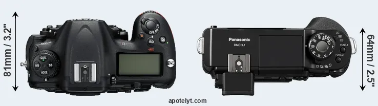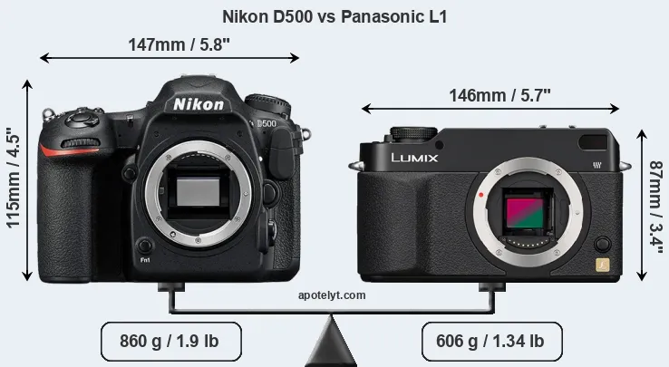 An illustration of the physical size and weight of the Nikon D500 and the Panasonic L1 is provided in the side-by-side display below. The two cameras are presented according to their relative size. Three successive views from the front, the top, and the rear are shown. All width, height and depth measures are rounded to the nearest millimeter.