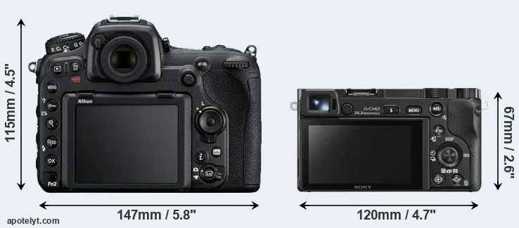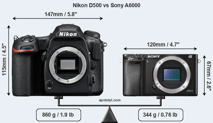 The side-by-side display below illustrates the physical size and weight of the Nikon D500 and the Sony A6000. The two cameras are presented according to their relative size. Three consecutive perspectives from the front, the top, and the back are available. All width, height and depth measures are rounded to the nearest millimeter.