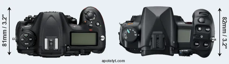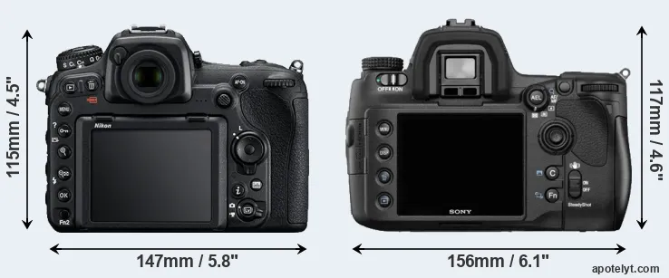 The side-by-side display below illustrates the physical size and weight of the Nikon D500 and the Sony A850. The two cameras are presented according to their relative size. Three consecutive perspectives from the front, the top, and the back are available. All width, height and depth measures are rounded to the nearest millimeter.