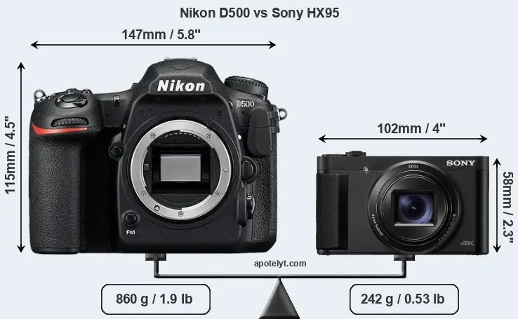 If the front view area (width x height) of the cameras is taken as an aggregate measure of their size, the Sony HX95 is considerably smaller (65 percent) than the Nikon D500. It is worth mentioning in this context that the D500 is splash and dust resistant, while the HX95 does not feature any corresponding weather-sealing.