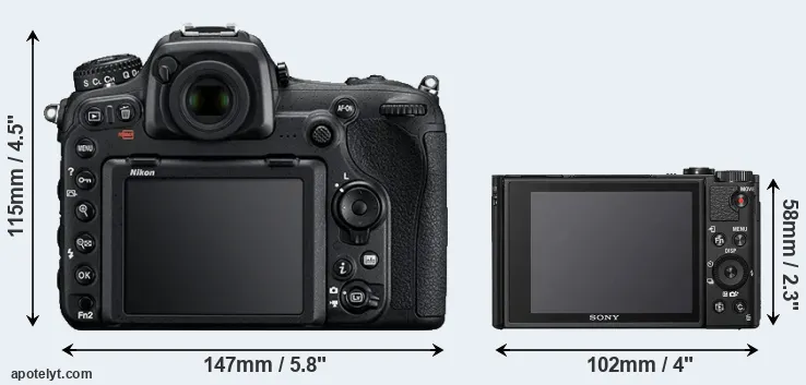 The side-by-side display below illustrates the physical size and weight of the Nikon D500 and the Sony HX95. The two cameras are presented according to their relative size. Three successive views from the front, the top, and the rear are shown. All width, height and depth measures are rounded to the nearest millimeter.