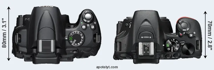 The side-by-side display below illustrates the physical size and weight of the Nikon D5000 and the Nikon D5500. The two cameras are presented according to their relative size. Three consecutive perspectives from the front, the top, and the back are available. All width, height and depth measures are rounded to the nearest millimeter.