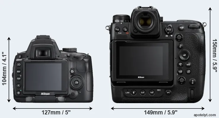 An illustration of the physical size and weight of the Nikon D5000 and the Nikon Z9 is provided in the side-by-side display below. The two cameras are presented according to their relative size. Three successive views from the front, the top, and the rear are shown. All width, height and depth dimensions are rounded to the nearest millimeter.