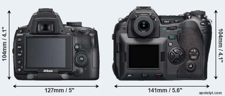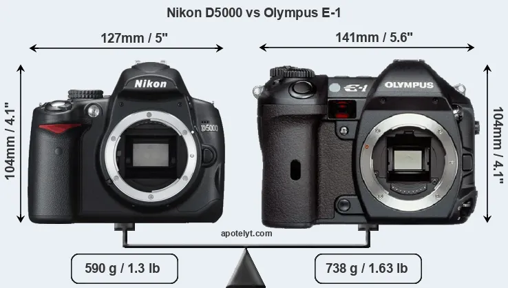 The side-by-side display below illustrates the physical size and weight of the Nikon D5000 and the Olympus E-1. The two cameras are presented according to their relative size. Three consecutive perspectives from the front, the top, and the back are available. All width, height and depth measures are rounded to the nearest millimeter.