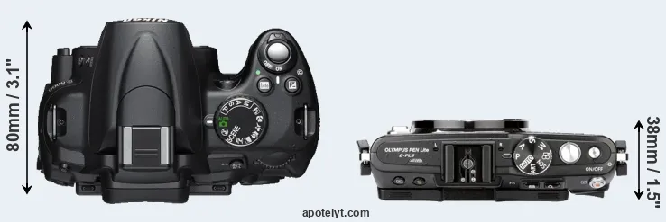 The side-by-side display below illustrates the physical size and weight of the Nikon D5000 and the Olympus E-PL5. The two cameras are presented according to their relative size. Three consecutive perspectives from the front, the top, and the back are available. All size dimensions are rounded to the nearest millimeter.