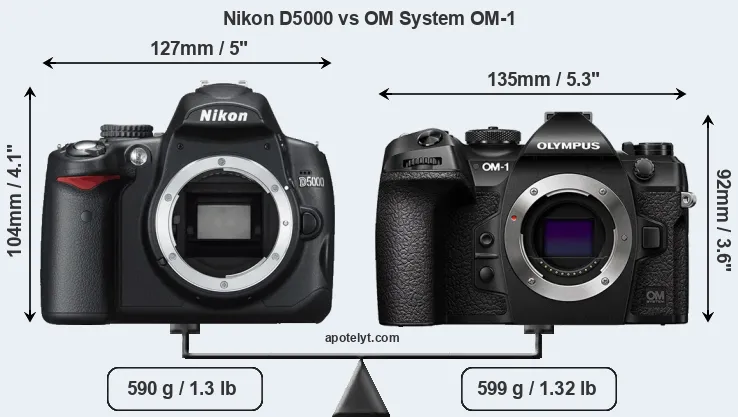 If the front view area (width x height) of the cameras is taken as an aggregate measure of their size, the OM System OM-1 is notably smaller (6 percent) than the Nikon D5000. However, the OM-1 is slightly heavier (2 percent) than the D5000. It is noteworthy in this context that the OM-1 is splash and dust-proof, while the D5000 does not feature any corresponding weather-sealing.
