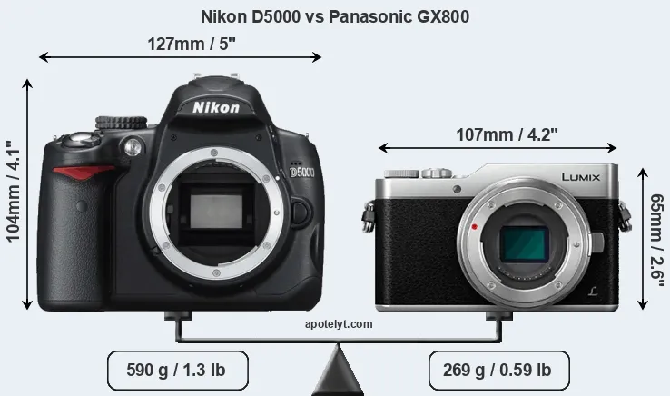 If the front view area (width x height) of the cameras is taken as an aggregate measure of their size, the Panasonic GX800 is considerably smaller (47 percent) than the Nikon D5000. Moreover, the GX800 is substantially lighter (54 percent) than the D5000. In this context, it is worth noting that neither the D5000 nor the GX800 are weather-sealed.