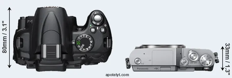 The side-by-side display below illustrates the physical size and weight of the Nikon D5000 and the Panasonic GX800. The two cameras are presented according to their relative size. Three consecutive views from the front, the top, and the rear side are shown. All width, height and depth dimensions are rounded to the nearest millimeter.