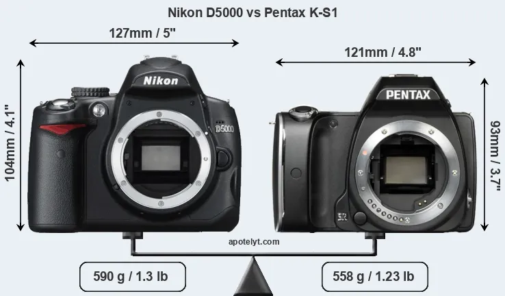 If the front view area (width x height) of the cameras is taken as an aggregate measure of their size, the Pentax K-S1 is notably smaller (15 percent) than the Nikon D5000. Moreover, the K-S1 is markedly lighter (5 percent) than the D5000. In this context, it is worth noting that neither the D5000 nor the K-S1 are weather-sealed.