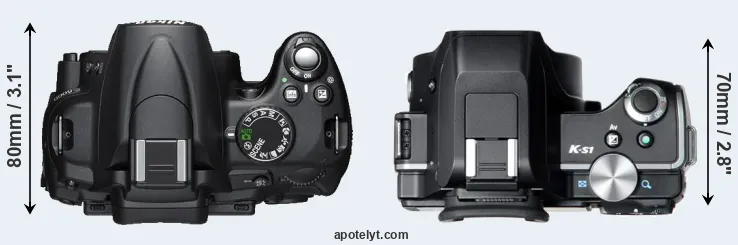The physical size and weight of the Nikon D5000 and the Pentax K-S1 are illustrated in the side-by-side display below. The two cameras are presented according to their relative size. Three consecutive views from the front, the top, and the rear side are shown. All width, height and depth dimensions are rounded to the nearest millimeter.
