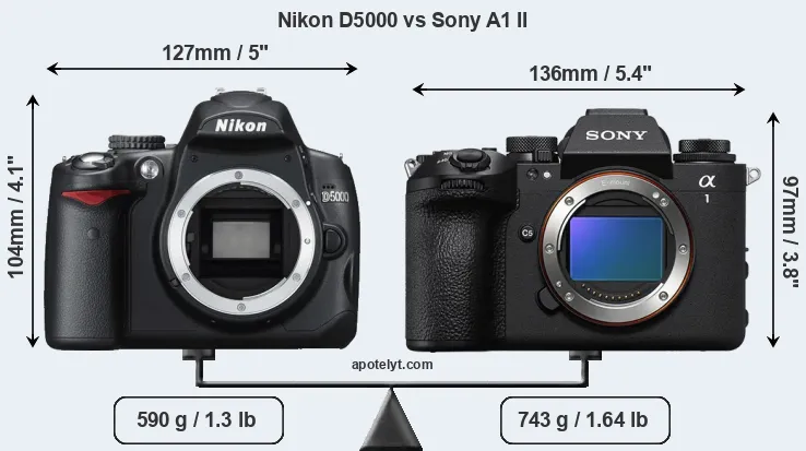 The side-by-side display below illustrates the physical size and weight of the Nikon D5000 and the Sony A1 II. The two cameras are presented according to their relative size. Three consecutive views from the front, the top, and the rear side are shown. All width, height and depth dimensions are rounded to the nearest millimeter.