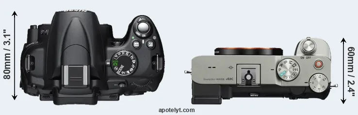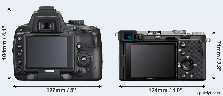 An illustration of the physical size and weight of the Nikon D5000 and the Sony A7C is provided in the side-by-side display below. The two cameras are presented according to their relative size. Three consecutive perspectives from the front, the top, and the back are available. All width, height and depth dimensions are rounded to the nearest millimeter.