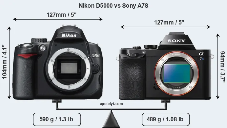 If the front view area (width x height) of the cameras is taken as an aggregate measure of their size, the Sony A7S is notably smaller (10 percent) than the Nikon D5000. Moreover, the A7S is markedly lighter (17 percent) than the D5000. It is noteworthy in this context that the A7S is splash and dust-proof, while the D5000 does not feature any corresponding weather-sealing.