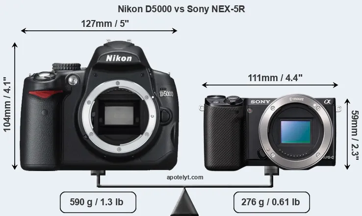 If the front view area (width x height) of the cameras is taken as an aggregate measure of their size, the Sony NEX-5R is considerably smaller (50 percent) than the Nikon D5000. Moreover, the NEX-5R is substantially lighter (53 percent) than the D5000. In this context, it is worth noting that neither the D5000 nor the NEX-5R are weather-sealed.
