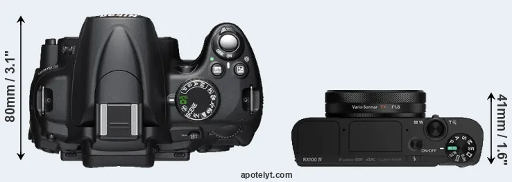 The side-by-side display below illustrates the physical size and weight of the Nikon D5000 and the Sony RX100 IV. The two cameras are presented according to their relative size. Three consecutive perspectives from the front, the top, and the back are available. All width, height and depth measures are rounded to the nearest millimeter.