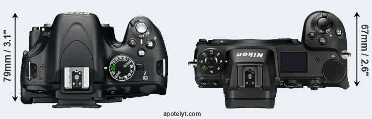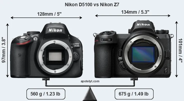 The side-by-side display below illustrates the physical size and weight of the Nikon D5100 and the Nikon Z7. The two cameras are presented according to their relative size. Three consecutive perspectives from the front, the top, and the back are available. All width, height and depth measures are rounded to the nearest millimeter.