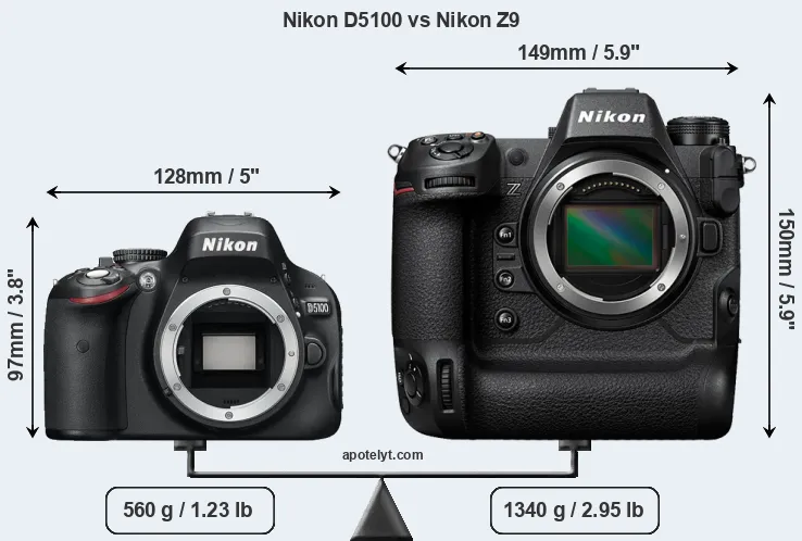 The physical size and weight of the Nikon D5100 and the Nikon Z9 are illustrated in the side-by-side display below. The two cameras are presented according to their relative size. Three consecutive perspectives from the front, the top, and the back are available. All width, height and depth dimensions are rounded to the nearest millimeter.