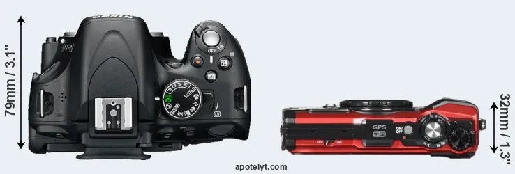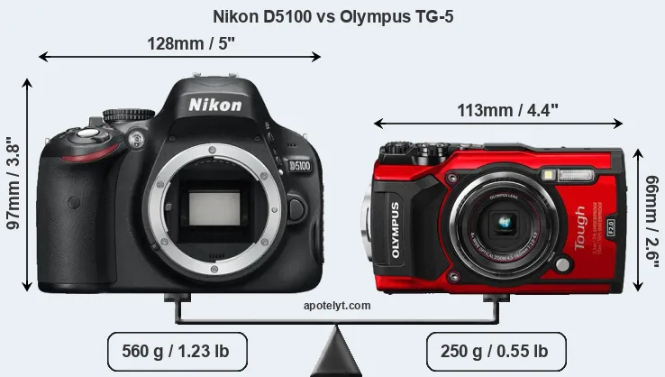 The side-by-side display below illustrates the physical size and weight of the Nikon D5100 and the Olympus TG-5. The two cameras are presented according to their relative size. Three successive views from the front, the top, and the rear are shown. All width, height and depth measures are rounded to the nearest millimeter.