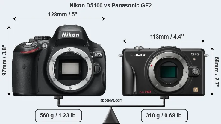 The side-by-side display below illustrates the physical size and weight of the Nikon D5100 and the Panasonic GF2. The two cameras are presented according to their relative size. Three successive views from the front, the top, and the rear are shown. All width, height and depth measures are rounded to the nearest millimeter.