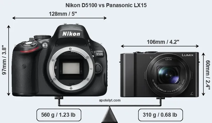 The physical size and weight of the Nikon D5100 and the Panasonic LX15 are illustrated in the side-by-side display below. The two cameras are presented according to their relative size. Three consecutive views from the front, the top, and the rear side are shown. All width, height and depth measures are rounded to the nearest millimeter.
