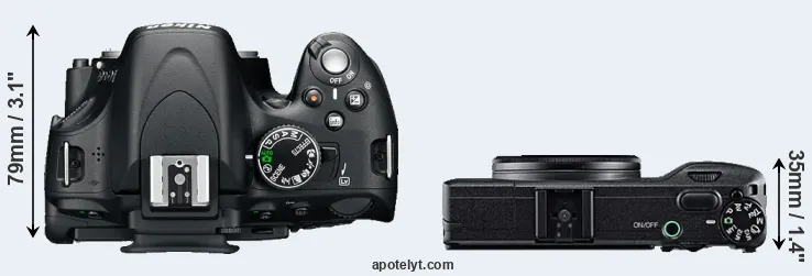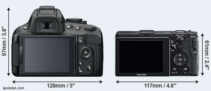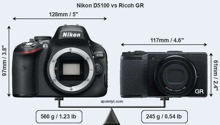 The side-by-side display below illustrates the physical size and weight of the Nikon D5100 and the Ricoh GR. The two cameras are presented according to their relative size. Three consecutive views from the front, the top, and the rear side are shown. All width, height and depth dimensions are rounded to the nearest millimeter.