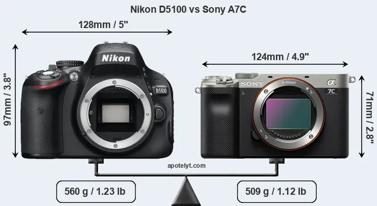 The physical size and weight of the Nikon D5100 and the Sony A7C are illustrated in the side-by-side display below. The two cameras are presented according to their relative size. Three successive views from the front, the top, and the rear are shown. All width, height and depth measures are rounded to the nearest millimeter.