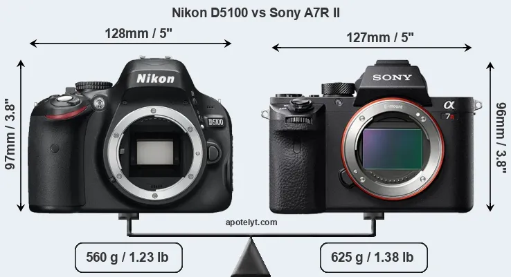 If the front view area (width x height) of the cameras is taken as an aggregate measure of their size, the Sony A7R II is somewhat smaller (2 percent) than the Nikon D5100. However, the A7R II is markedly heavier (12 percent) than the D5100. It is noteworthy in this context that the A7R II is splash and dust-proof, while the D5100 does not feature any corresponding weather-sealing.